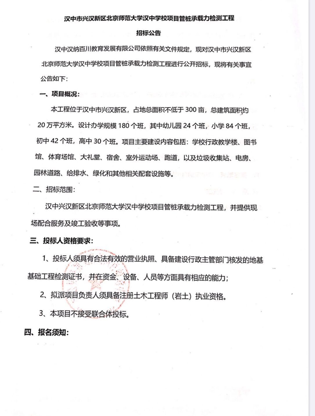 漢中市興漢新區(qū)北京師范大學(xué)漢中學(xué)校項(xiàng)目管樁承載力檢測工程招標(biāo)公告 漢中漢納百川教育發(fā)展有限公司...